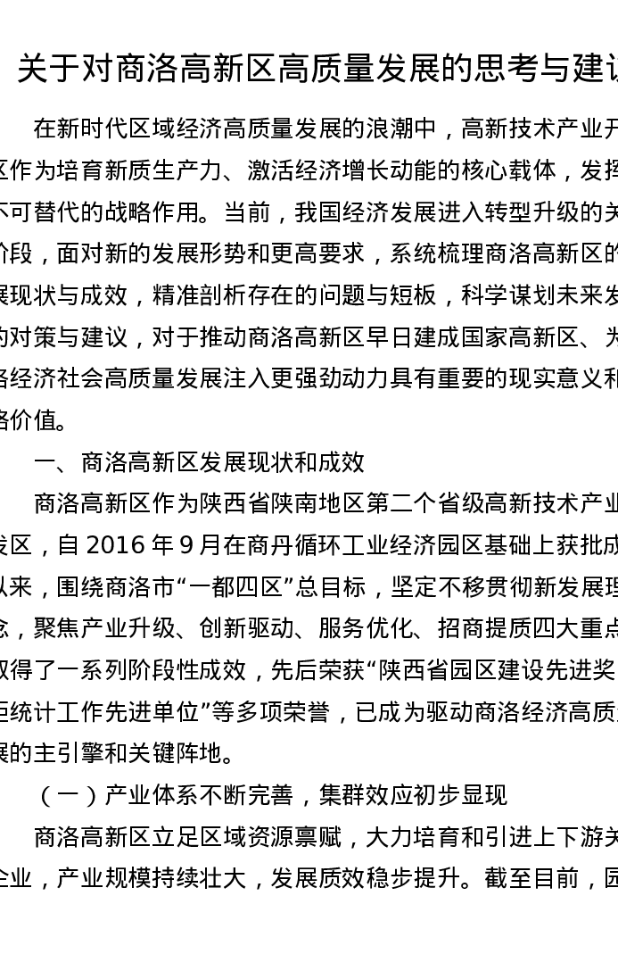 调研报告:关于对商洛高新区高质量发展的思考与建议