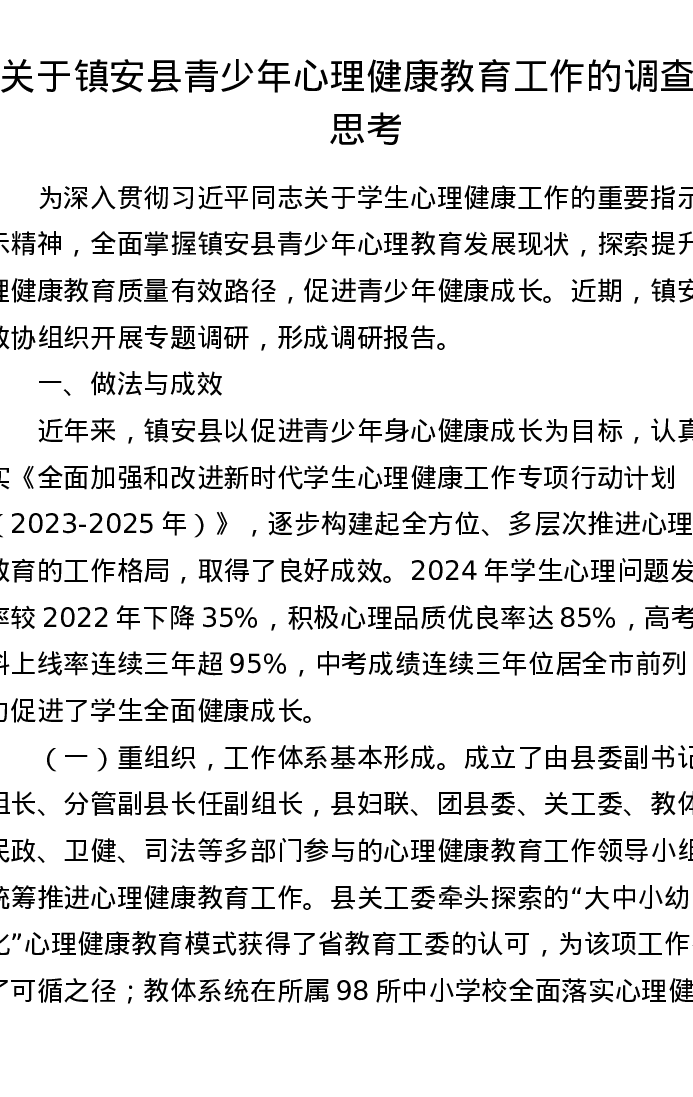调研报告:关于镇安县青少年心理健康教育工作的调查与思考
