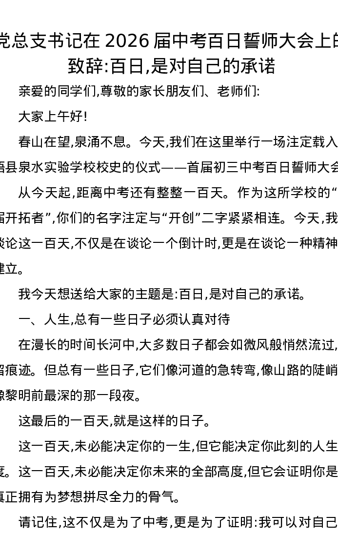党总支书记在2026届中考百日誓师大会上的致辞百日,是对自己的承诺