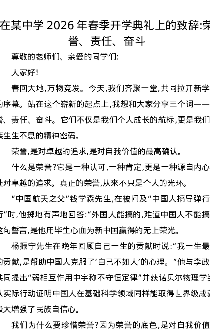 在某中学2026年春季开学典礼上的致辞荣誉、责任、奋斗