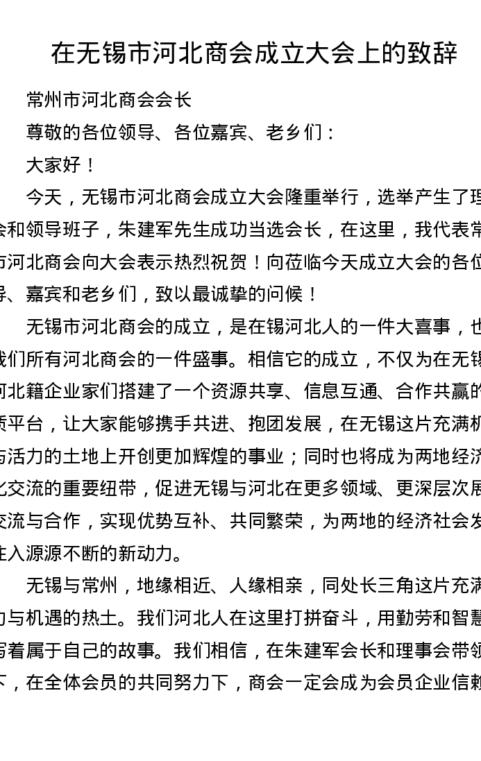 在无锡市河北商会成立大会上的致辞