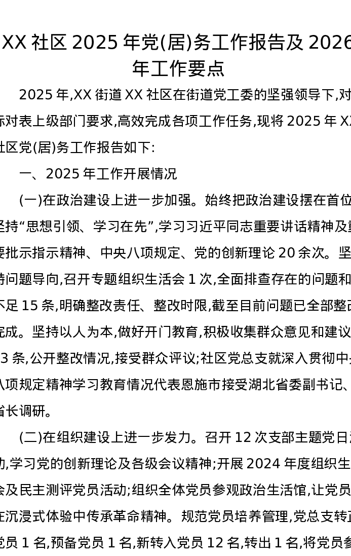 XX社区2025年党(居)务工作报告及2026年工作要点
