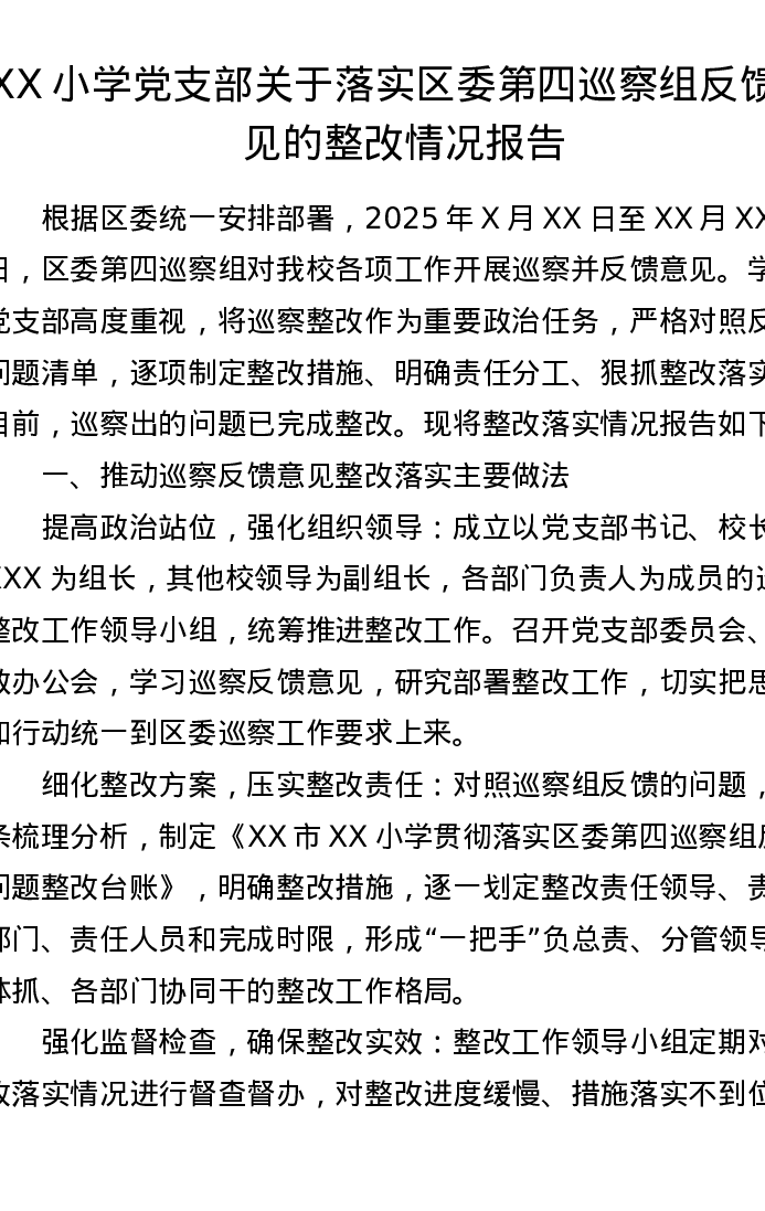 XX小学党支部关于落实区委第四巡察组反馈意见的整改情况报告