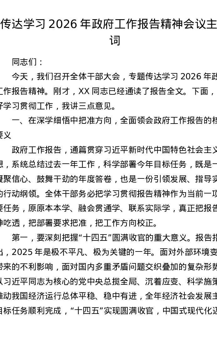 传达学习2026年政府工作报告精神会议主持词(3379字)