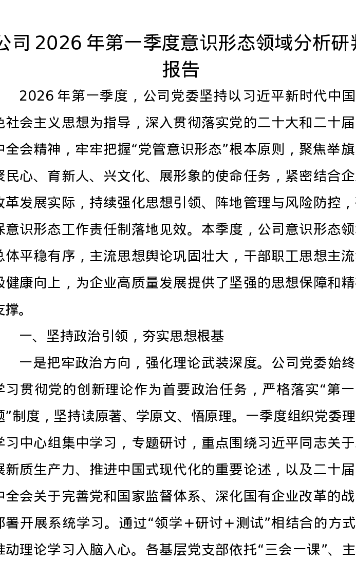 公司2026年第一季度意识形态领域分析研判报告