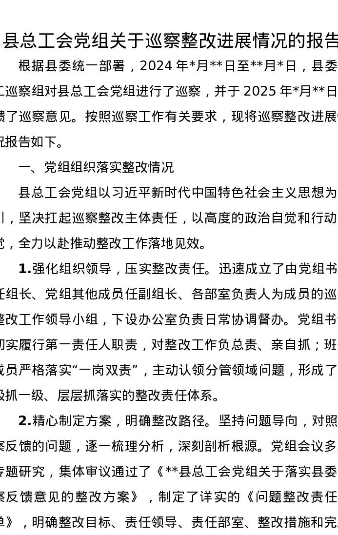 县总工会党组关于巡察整改进展情况的报告