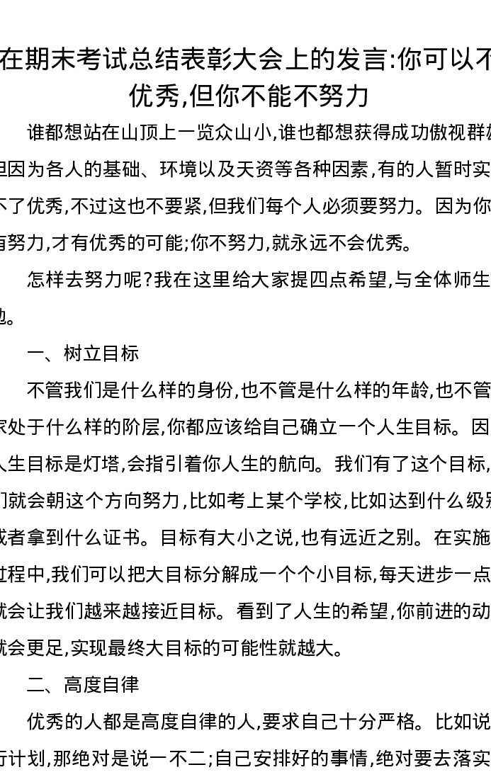 在期末考试总结表彰大会上的发言:你可以不优秀,但你不能不努力