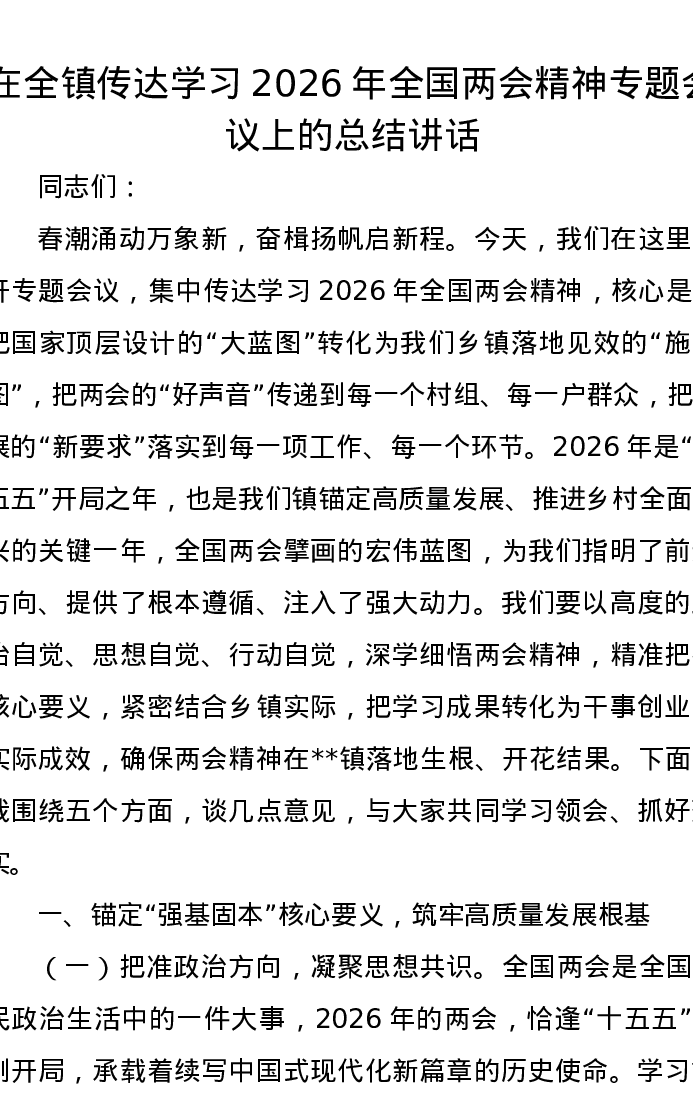 在全镇传达学习2026年全国两会精神专题会议上的总结讲话