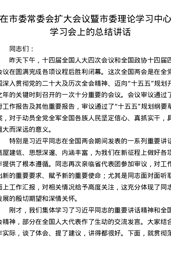 在市委常委会扩大会议暨市委理论学习中心组学习会上的总结讲话