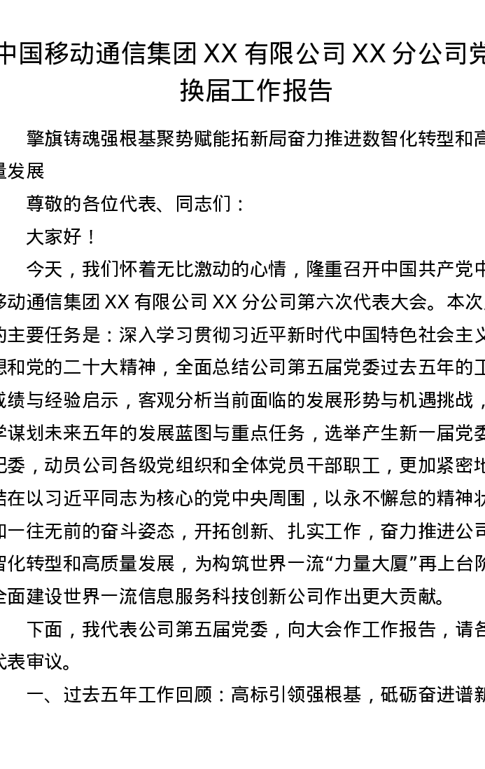 中国移动通信集团XX有限公司XX分公司党委换届工作报告2