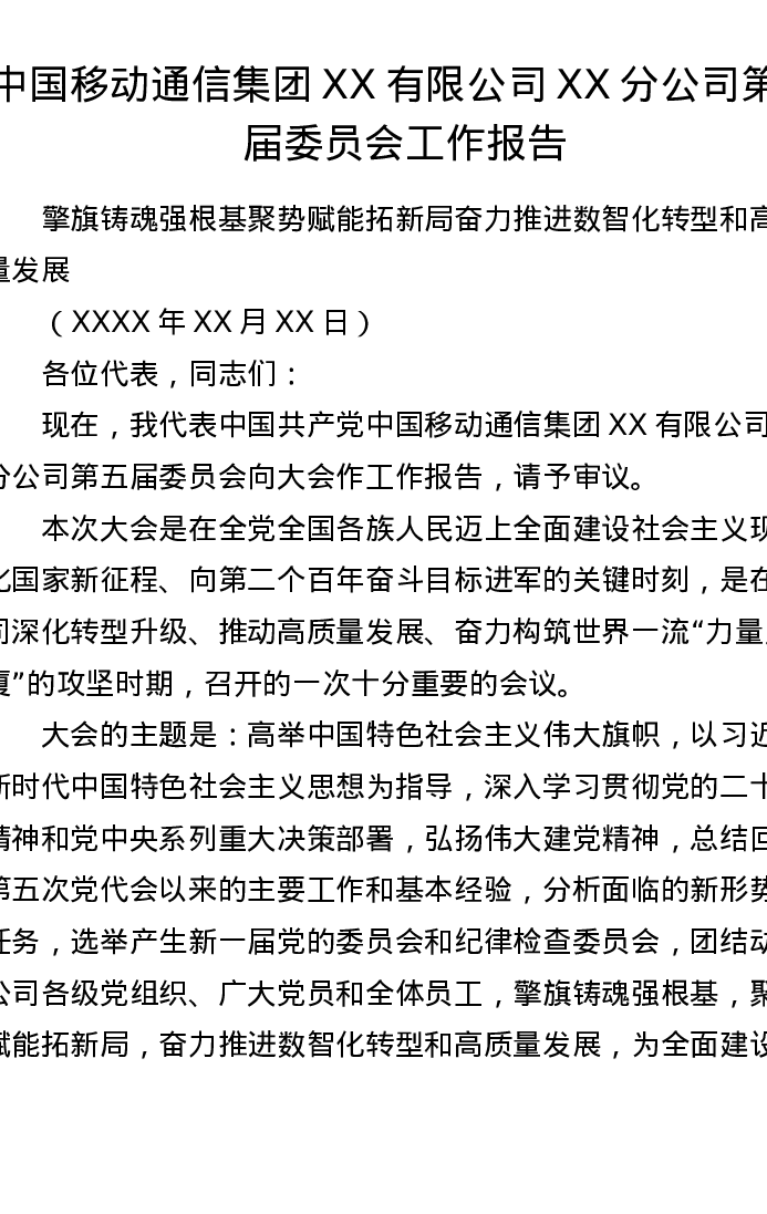 中国移动通信集团XX有限公司XX分公司第六届委员会工作报告