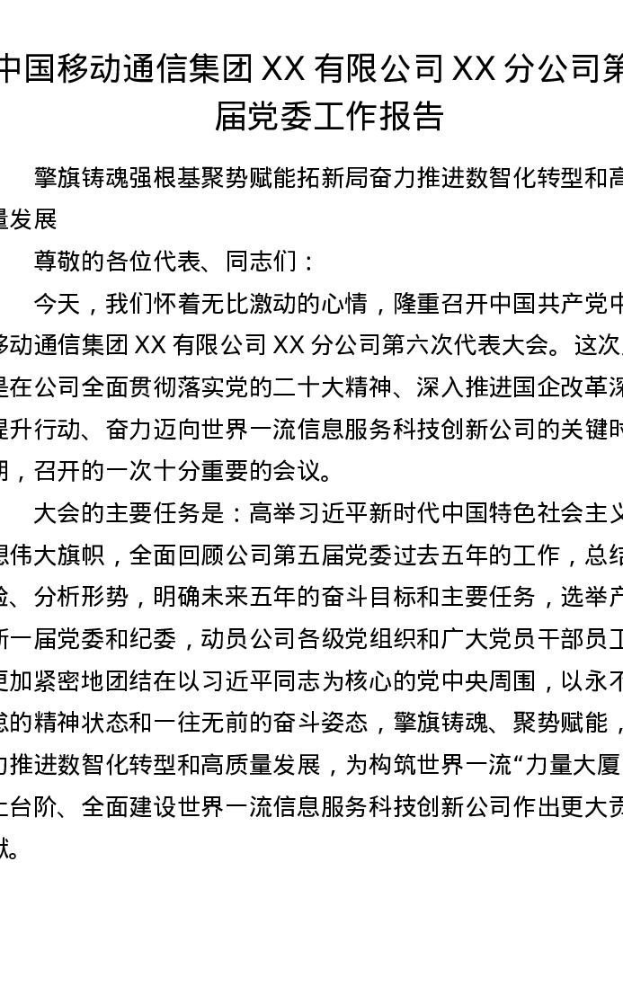 中国移动通信集团XX有限公司XX分公司第五届党委工作报告