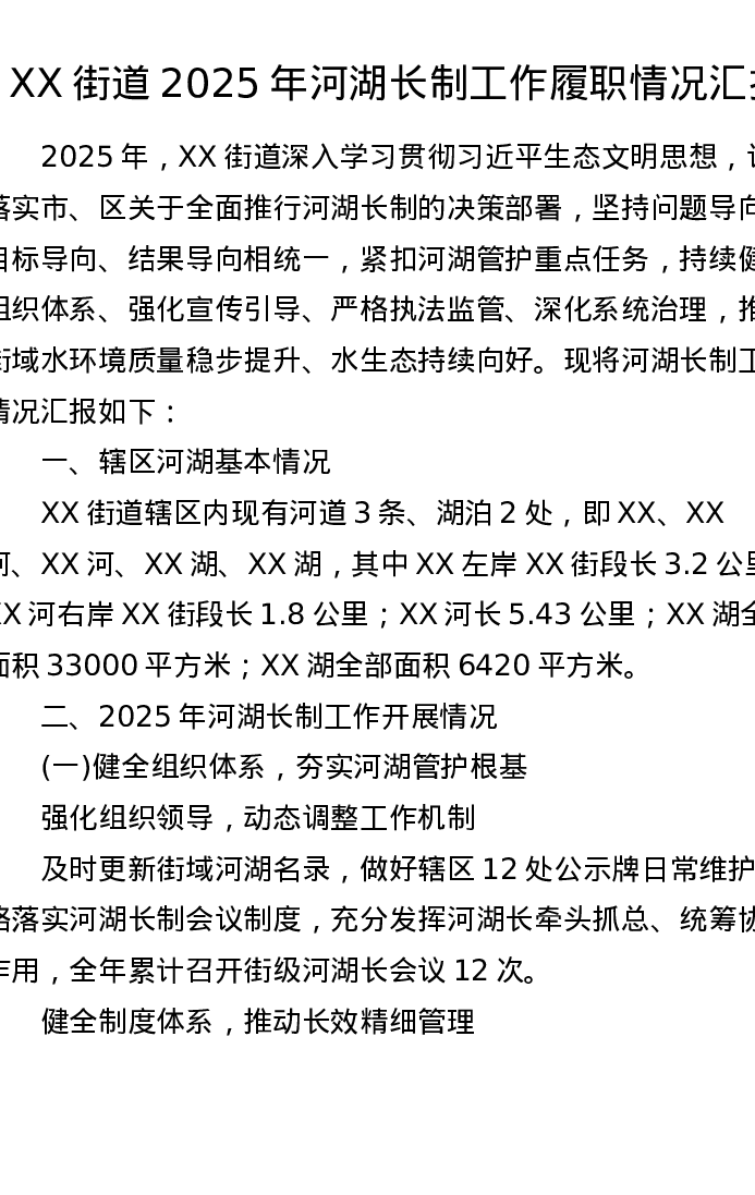 XX 街道 2025 年河湖长制工作履职情况汇报