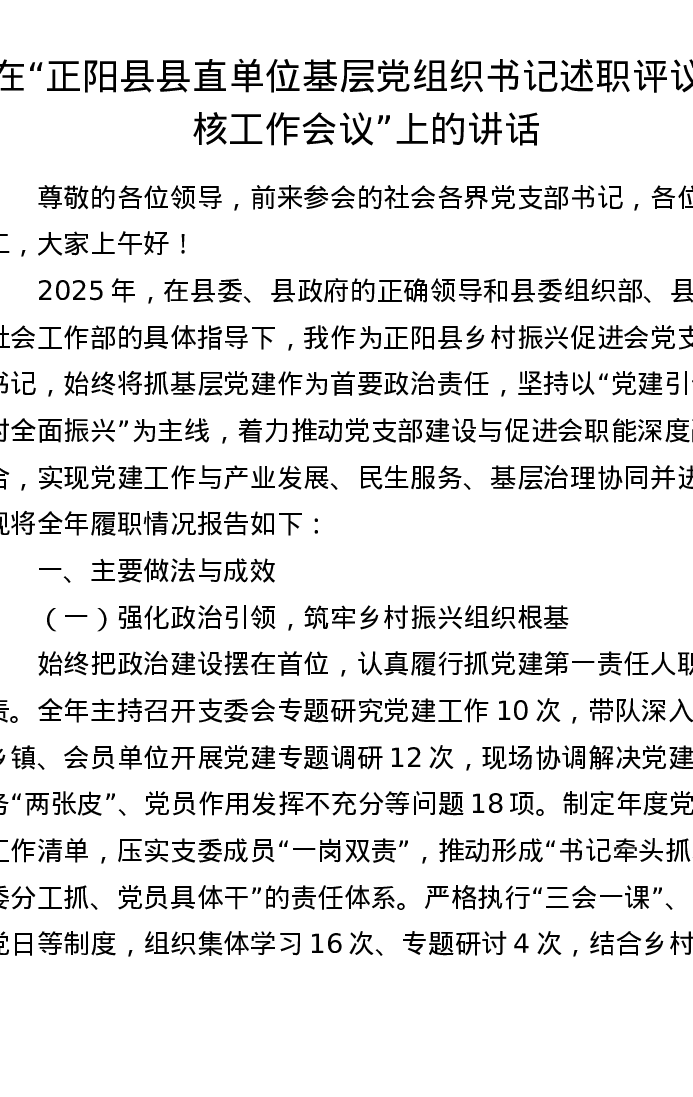 在正阳县县直单位基层党组织书记述职评议考核工作会议上的讲话