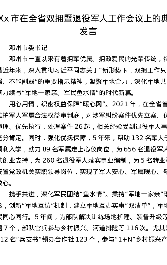 Xx市在全省双拥暨退役军人工作会议上的典型发言