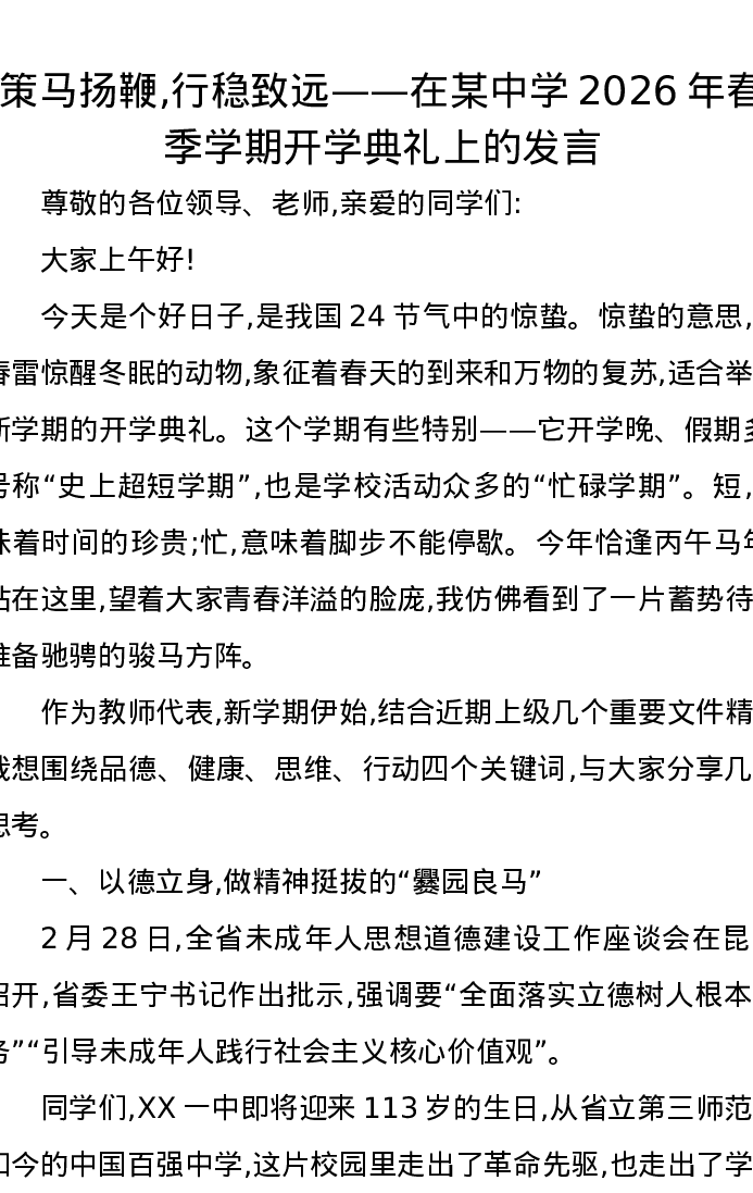策马扬鞭,行稳致远——在某中学2026年春季学期开学典礼上的发言