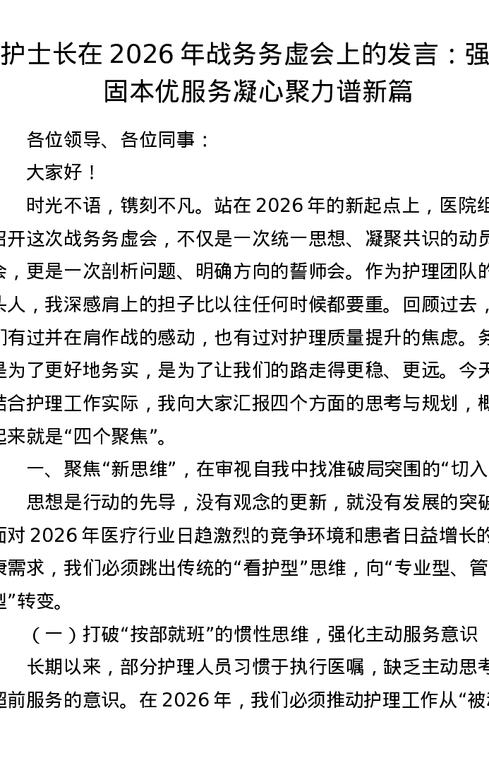 护士长在2026年战务务虚会上的发言:强基固本优服务 凝心聚力谱新篇