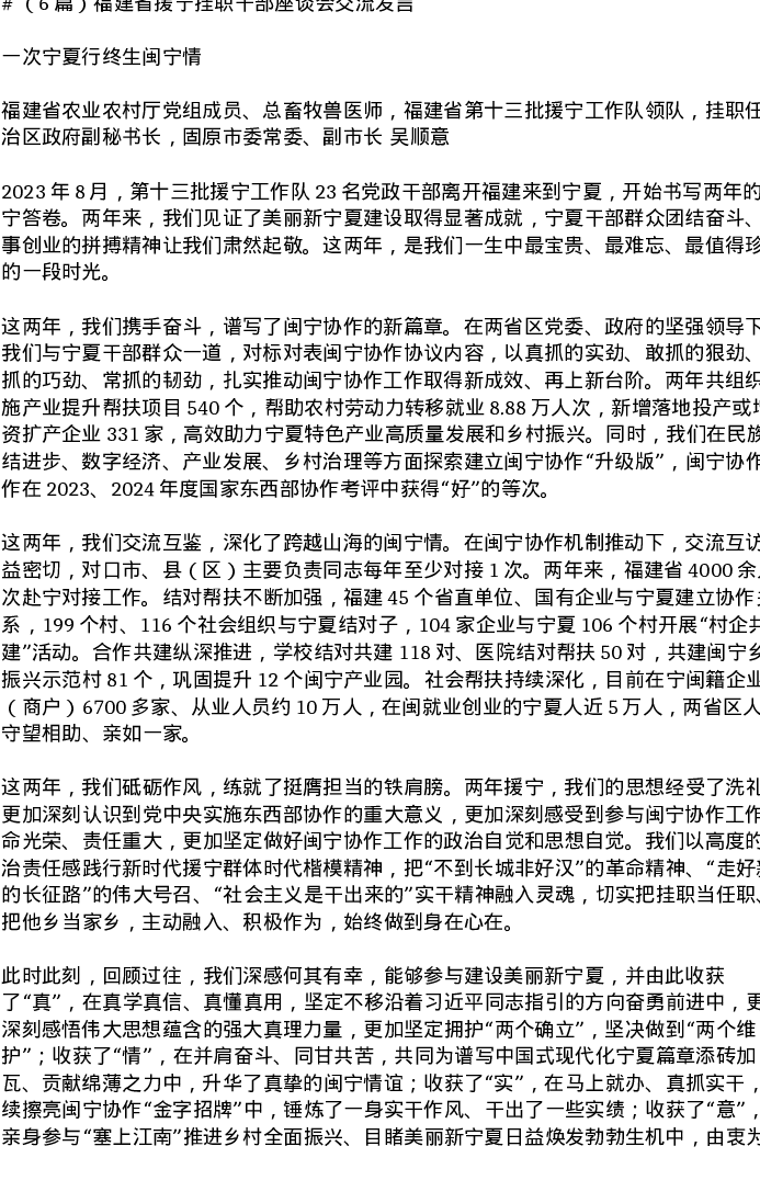 汇编:福建省援宁挂职干部座谈会交流发言6篇