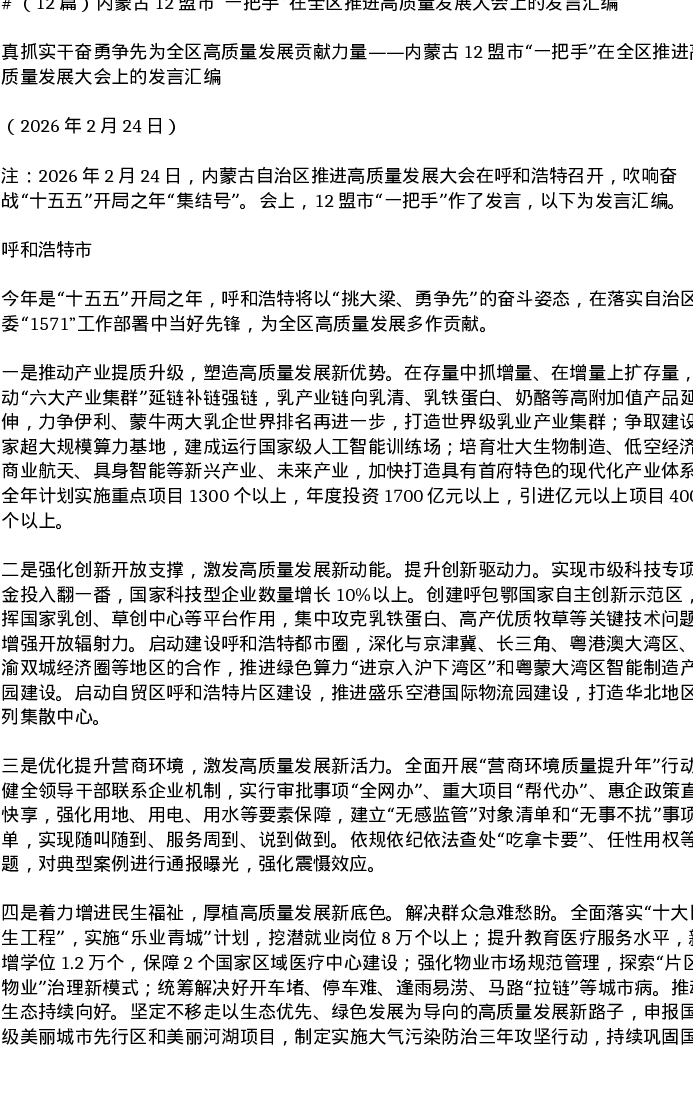 汇编:内蒙古12盟市一把手在全区推进高质量发展大会上的发言12篇