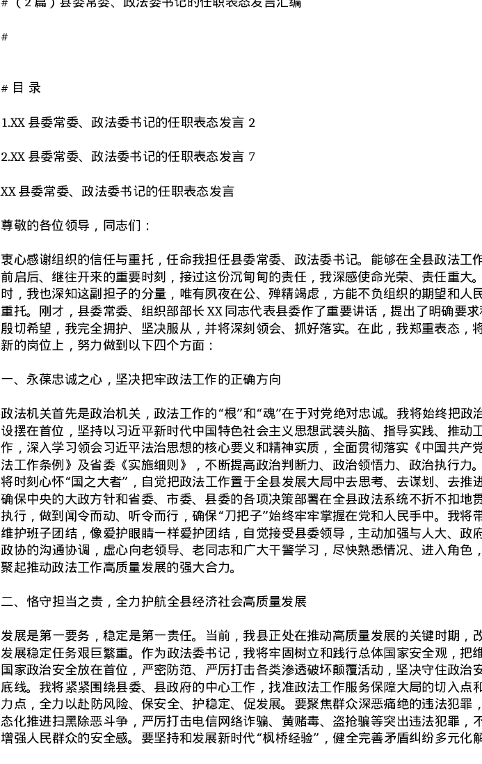 汇编:县委常委、政法委书记的任职表态发言2篇