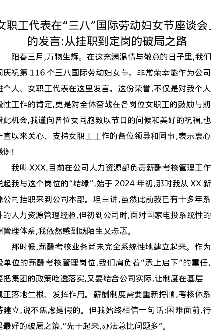 女职工代表在三八国际劳动妇女节座谈会上的发言从挂职到定岗的破局之路
