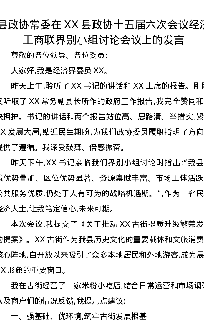 县政协常委在XX县政协十五届六次会议经济、工商联界别小组讨论会议上的发言