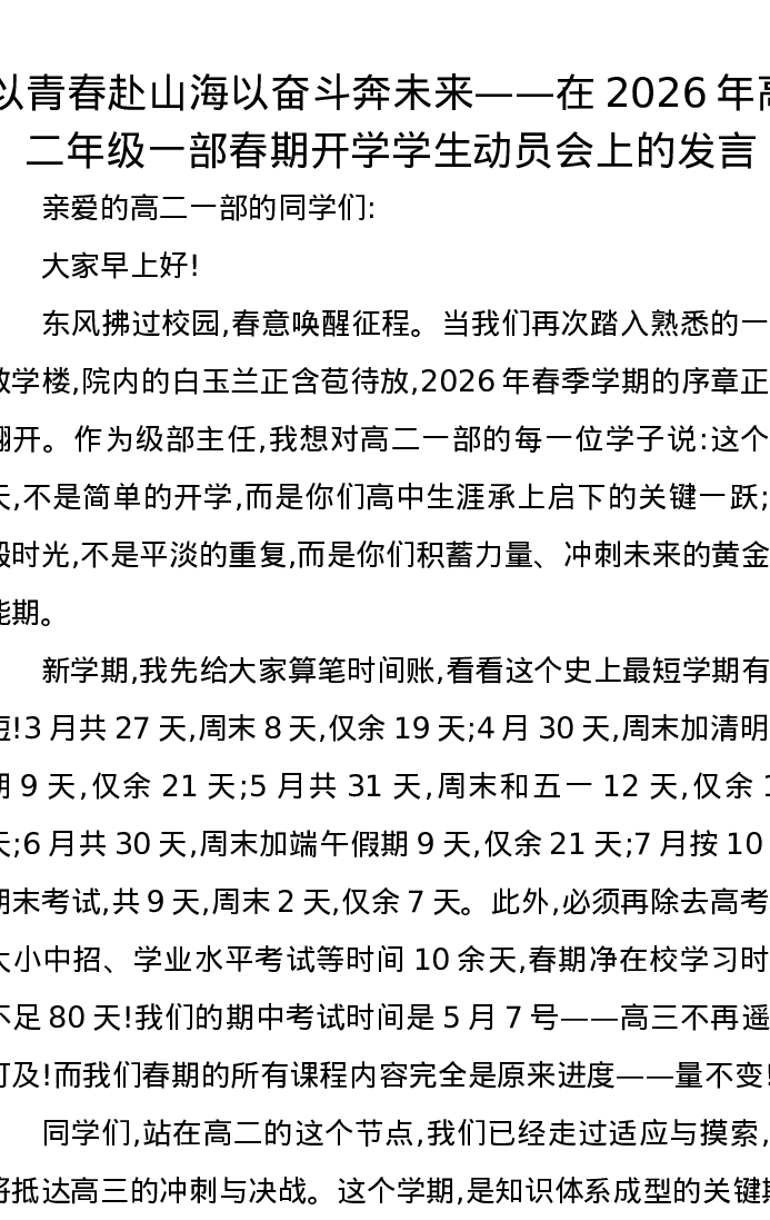 以青春赴山海以奋斗奔未来——在2026年高二年级一部春期开学学生动员会上的发言
