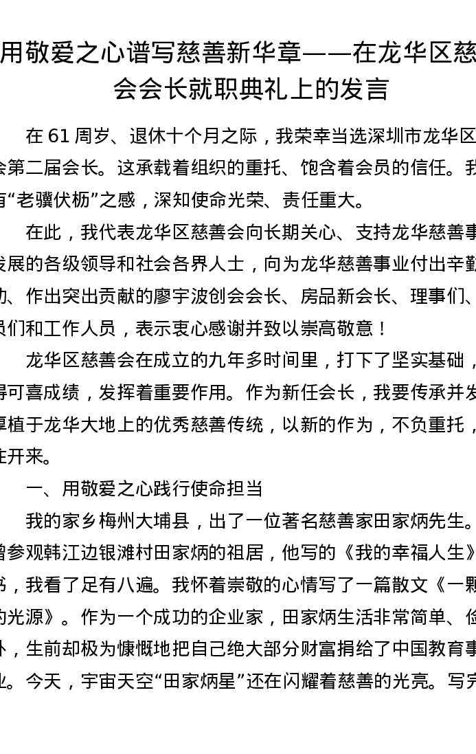 用敬爱之心谱写慈善新华章——在龙华区慈善会会长就职典礼上的发言