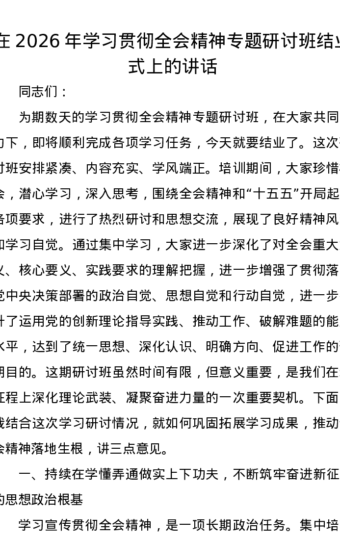 在2026年学习贯彻全会精神专题研讨班结业式上的讲话