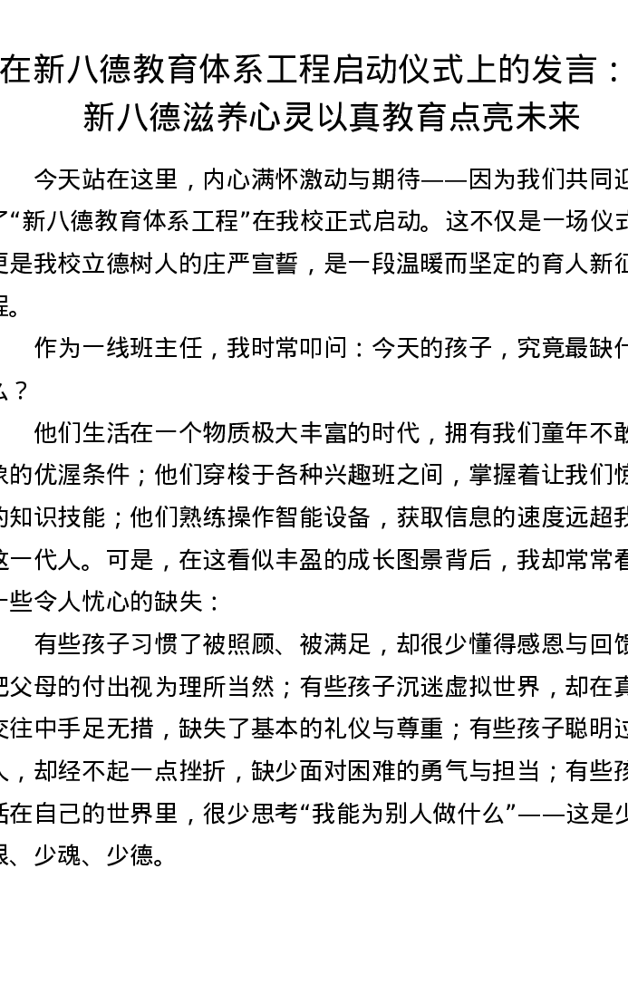 在新八德教育体系工程启动仪式上的发言:以新八德滋养心灵 以真教育点亮未来