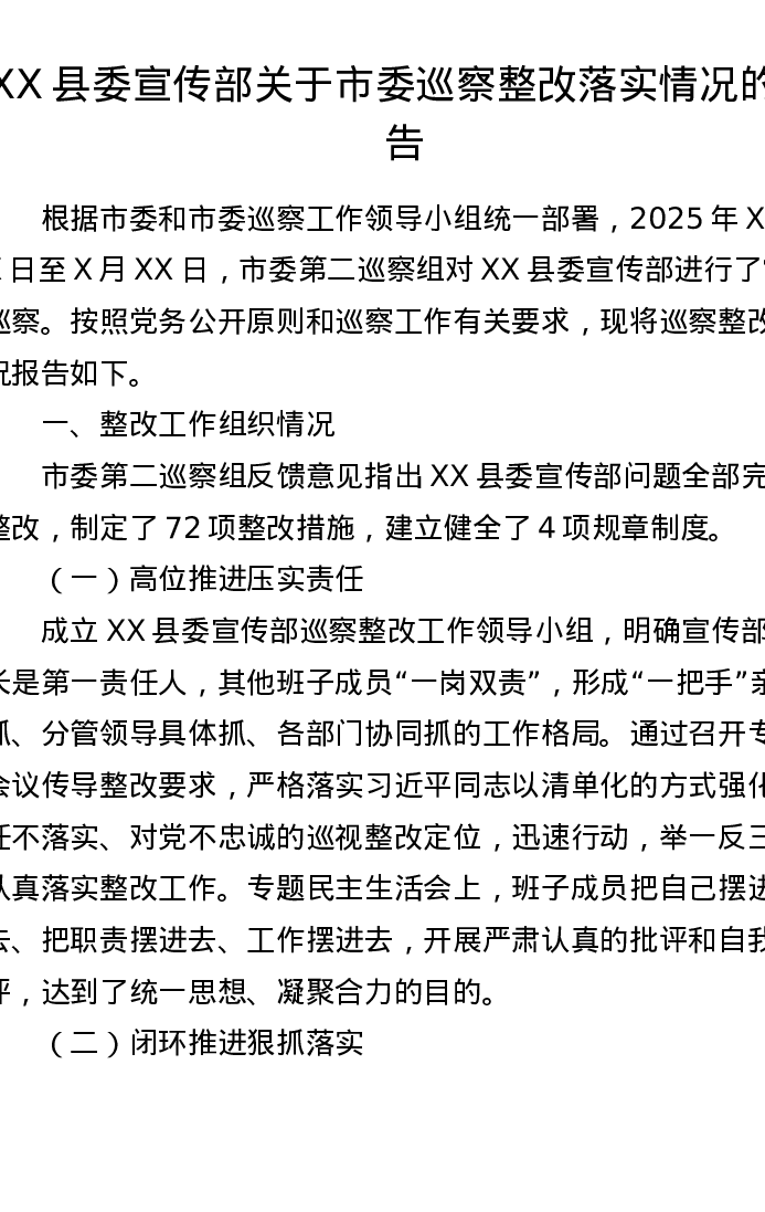 XX县委宣传部关于市委巡察整改落实情况的报告