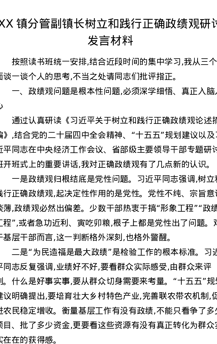 XX镇分管副镇长树立和践行正确政绩观研讨发言材料