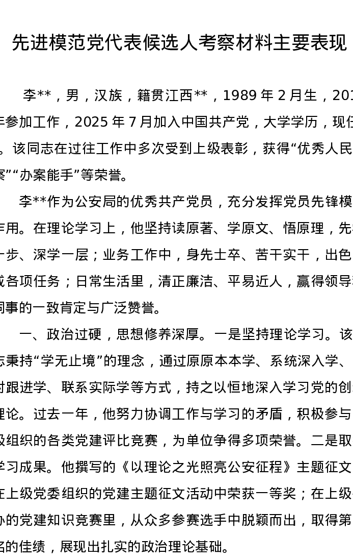 先进模范党代表候选人考察材料主要表现