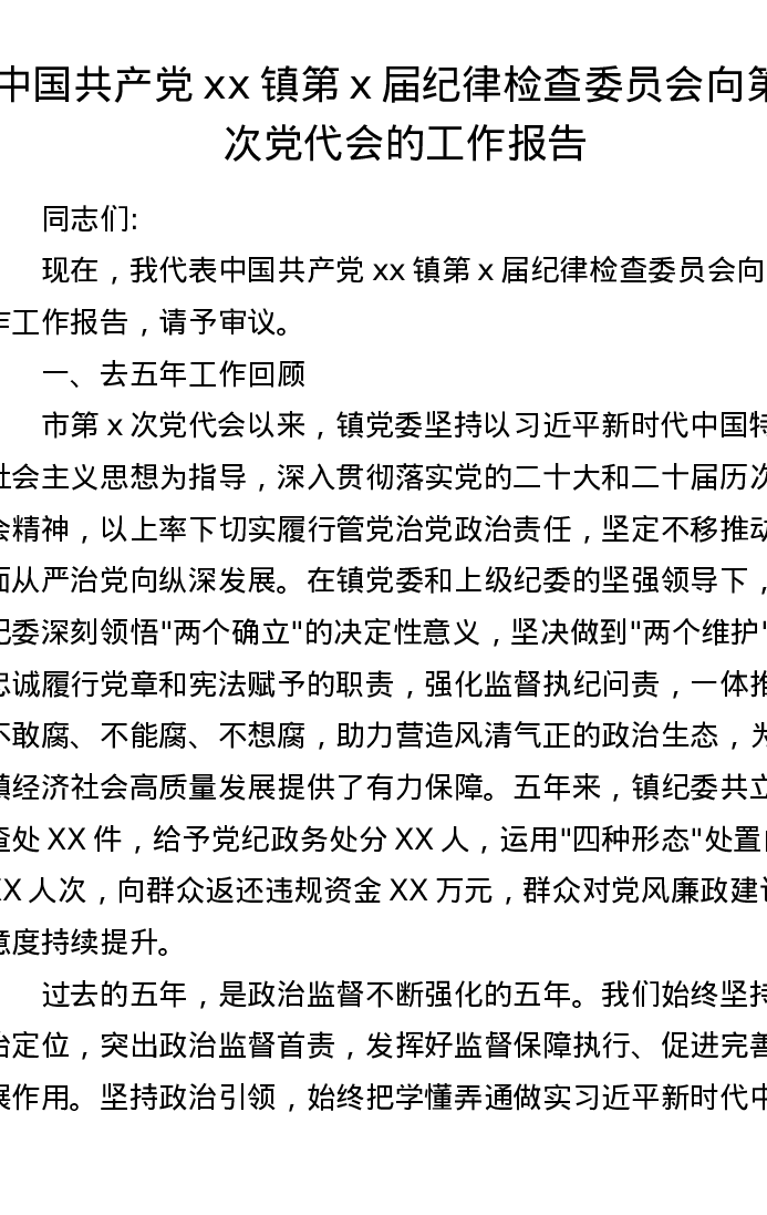 中国共产党xx镇第x届纪律检查委员会向第x次党代会的工作报告