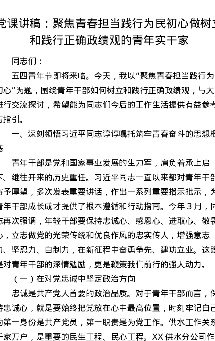 党课讲稿:聚焦青春担当践行为民初心做树立和践行正确ZJG的青年实干家