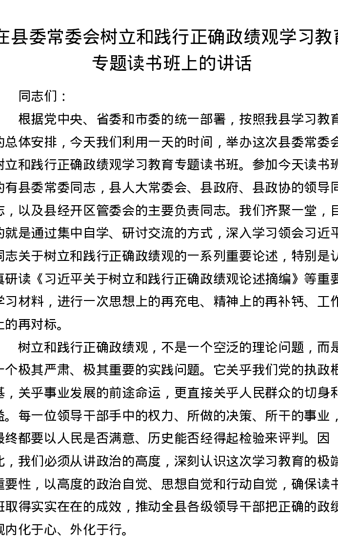 在县委常委会树立和践行正确ZJG学习教育专题读书班上的讲话