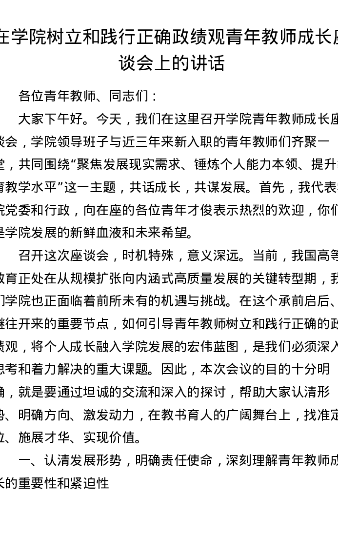 在学院树立和践行正确ZJG青年教师成长座谈会上的讲话