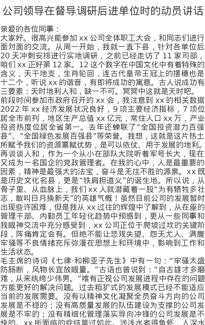 公司领导在督导调研后进单位时的动员讲话