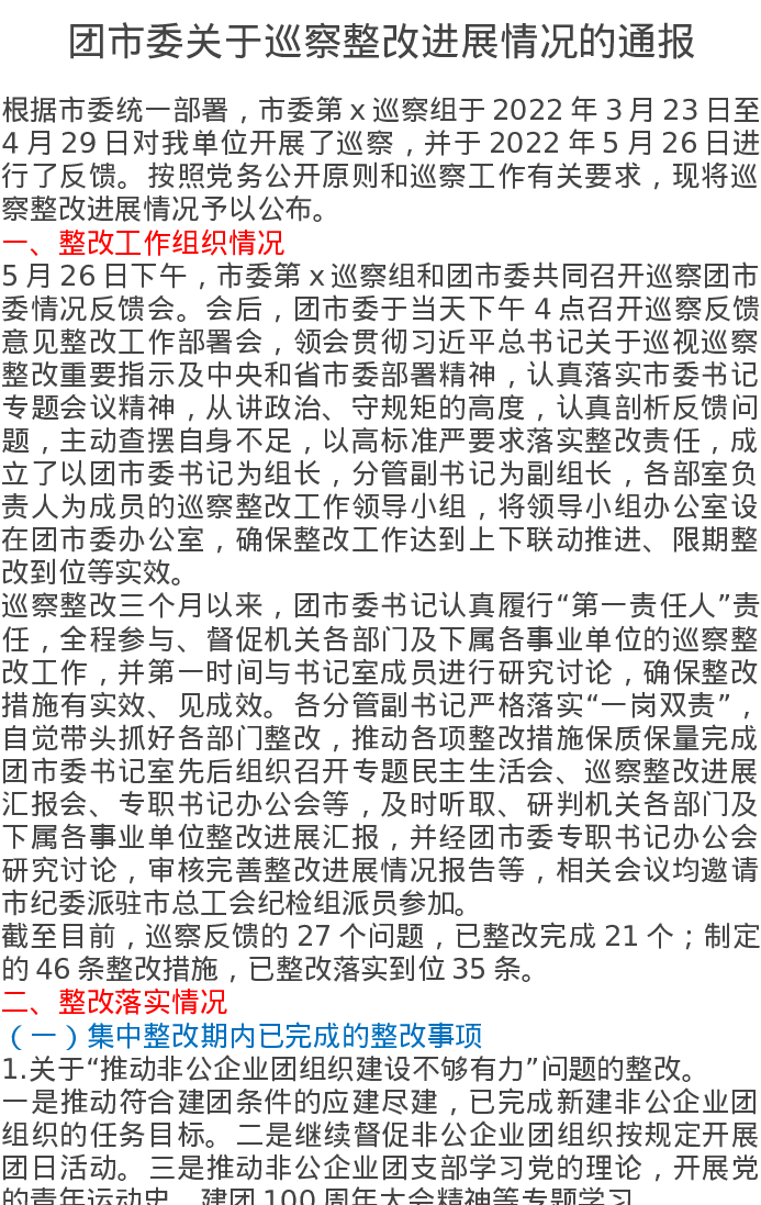 团市委关于巡察整改进展情况的通报