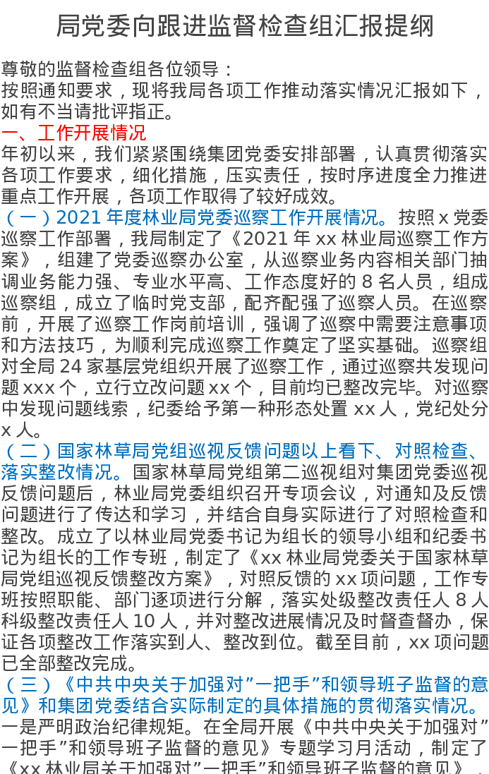 局党委向跟进监督检查组汇报提纲