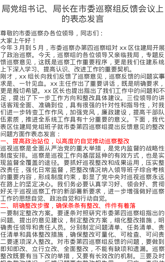 局党组书记、局长在市委巡察组反馈会议上的表态发言