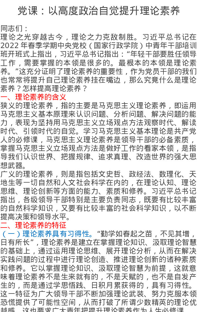 党课讲稿:以高度政治自觉提升理论素养