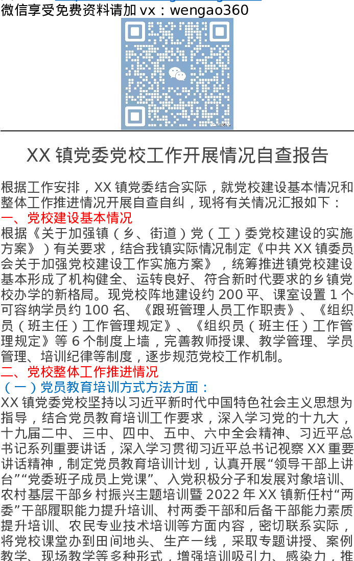 XX镇党委党校工作开展情况自查报告