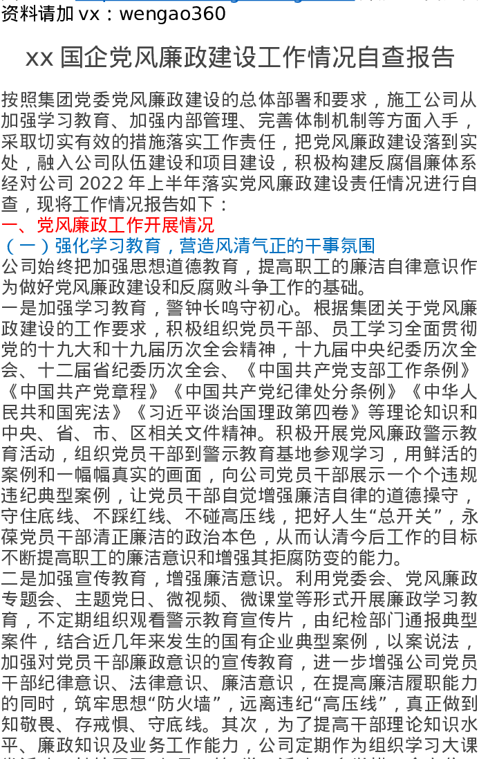 xx国企党风廉政建设工作情况自查报告