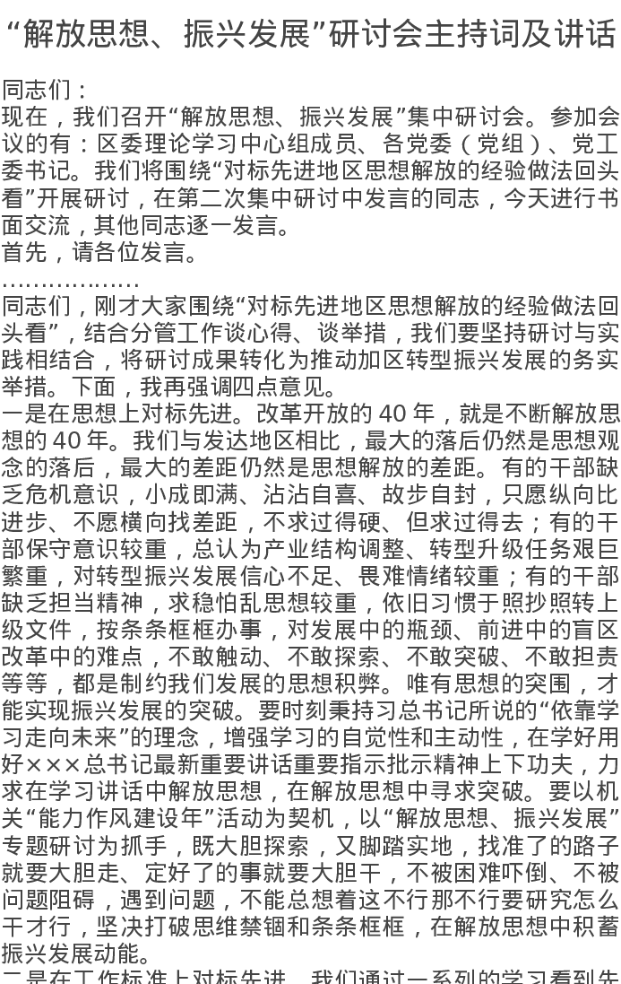 “解放思想、振兴发展”研讨会主持词及讲话