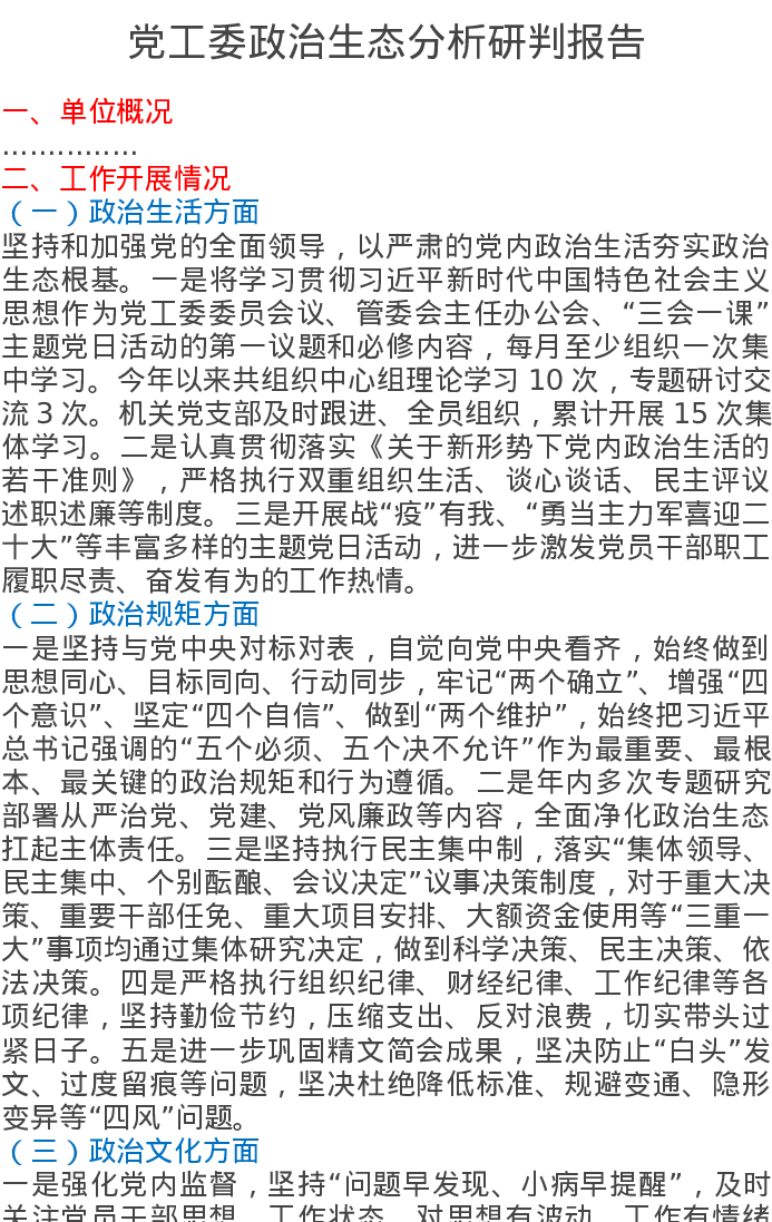 党工委政治生态分析研判报告