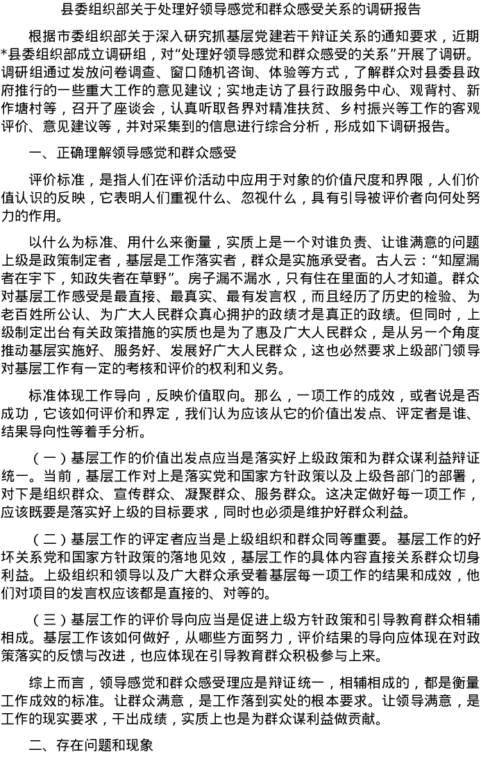 20220607县委组织部关于处理好领导感觉和群众感受关系的调研报告