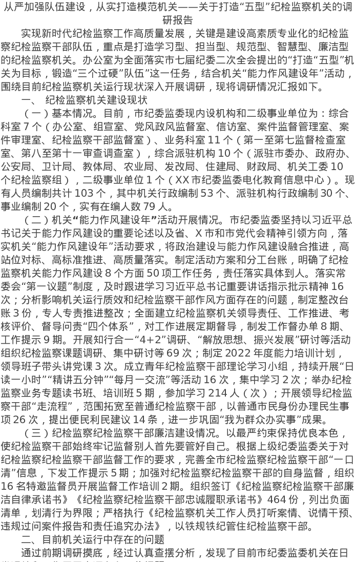 20220715从严加强队伍建设,从实打造模范机关——关于打造“五型”纪检监察机关的调研报告