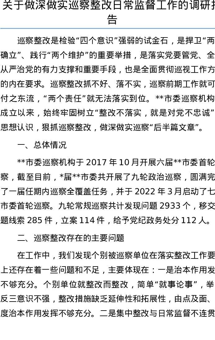 20220804关于做深做实巡察整改日常监督工作的调研报告