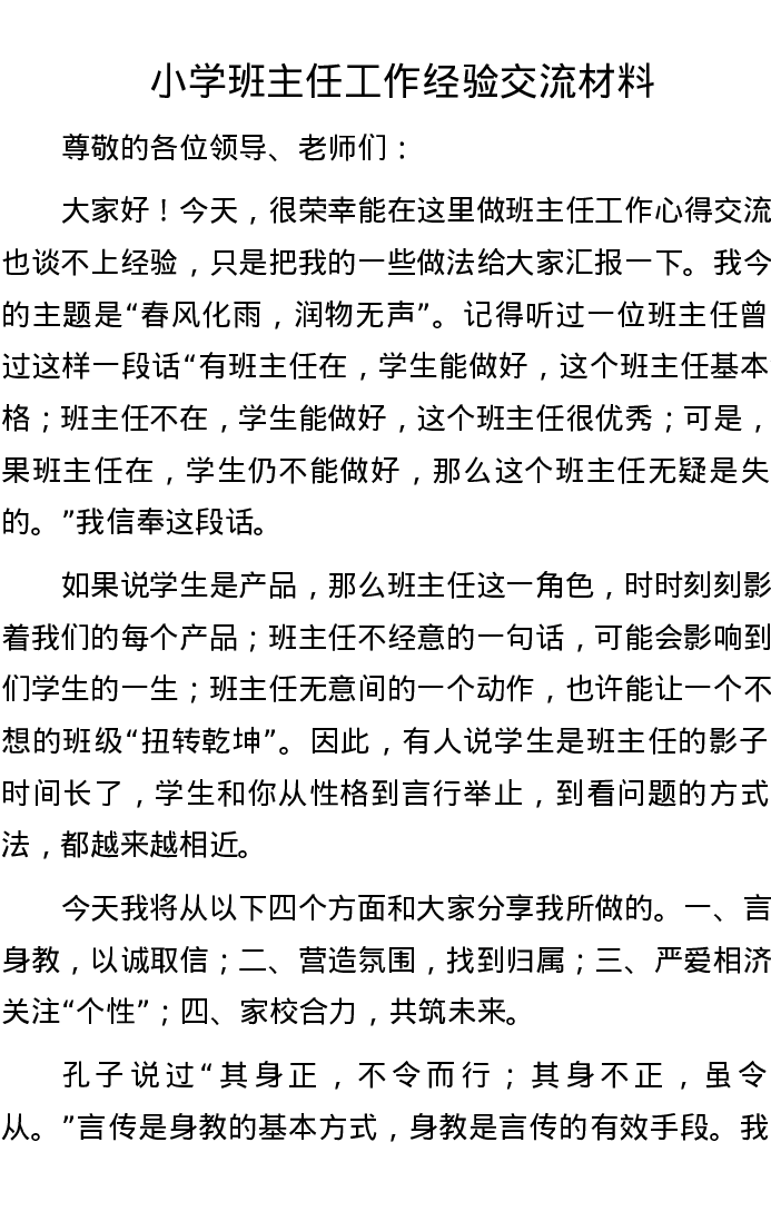 20221014小学班主任工作经验交流材料